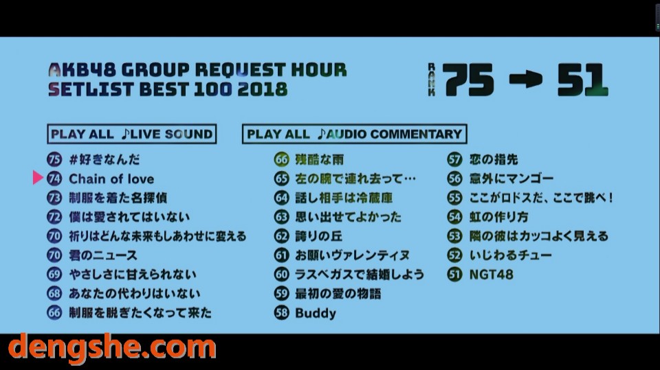 - 光盘标签:6730 . AKB48组合.AKB48 Group Request Hour Setlist Best 100.2018乐曲年度选拔演唱会.165G.五碟.1080P高清蓝光原盘演唱会.ISO