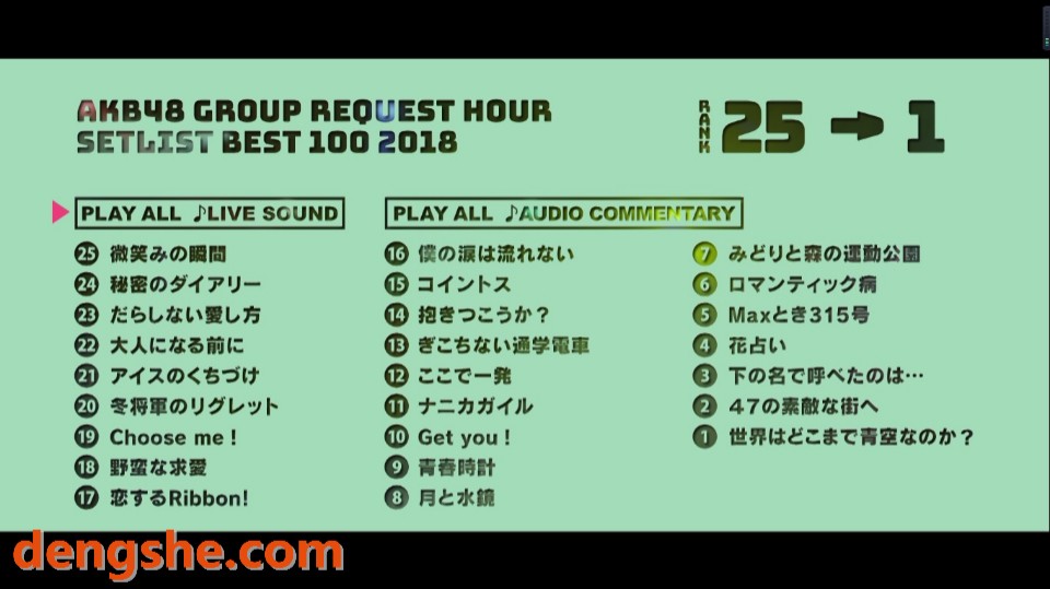 - 光盘标题:AKB48组合.AKB48 Group Request Hour Setlist Best 100.2018乐曲年度选拔演唱会.165G.五碟.1080P高清蓝光原盘演唱会.ISO